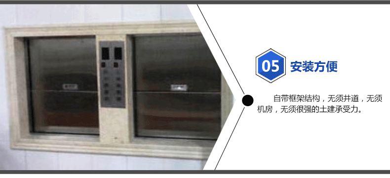 5.安裝方便:自帶框架結(jié)構(gòu),無(wú)須井道,無(wú)須機(jī)房,無(wú)須很強(qiáng)的土建承受力。