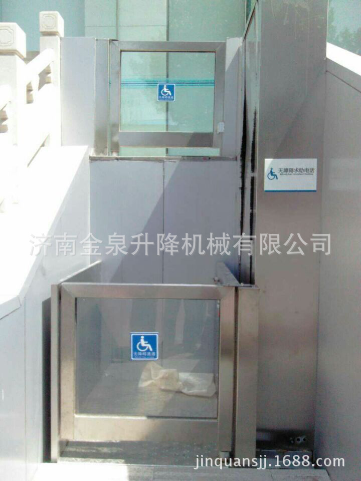 濟(jì)南金泉升降機(jī)械有限公司生產(chǎn)的無障礙殘疾人升降平臺(tái)由升降平臺(tái)、導(dǎo)軌和驅(qū)動(dòng)箱等三大部分組成;升降平臺(tái)是由C型鋼材為主體部件,采用“翹板自復(fù)位開關(guān)操作運(yùn)行”, 無基坑式安裝,直接固定于混凝土地面(無底坑室外應(yīng)用情況下,平臺(tái)下方混凝土地面不得低于周圍地面) ,手動(dòng)液壓閥打開時(shí)升降底板能手動(dòng)下降;液壓驅(qū)動(dòng),升降平穩(wěn)安全,外部采用拉絲不銹鋼材料和鋁板靜電噴塑機(jī)箱/面板,外形小巧美觀,不阻礙周邊環(huán)境。殘疾人升降機(jī)直接安裝于地面,無需土建配套地坑,施工簡(jiǎn)便,產(chǎn)品放置戶外不易積水,不易生銹,維護(hù)簡(jiǎn)便。升降高度1-12米!根據(jù)客戶升高高度量身定制,歡迎大家來電咨詢。金泉機(jī)械