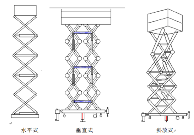 常用剪叉升降平臺的幾種結構形式:垂直式 斜放式 水平式