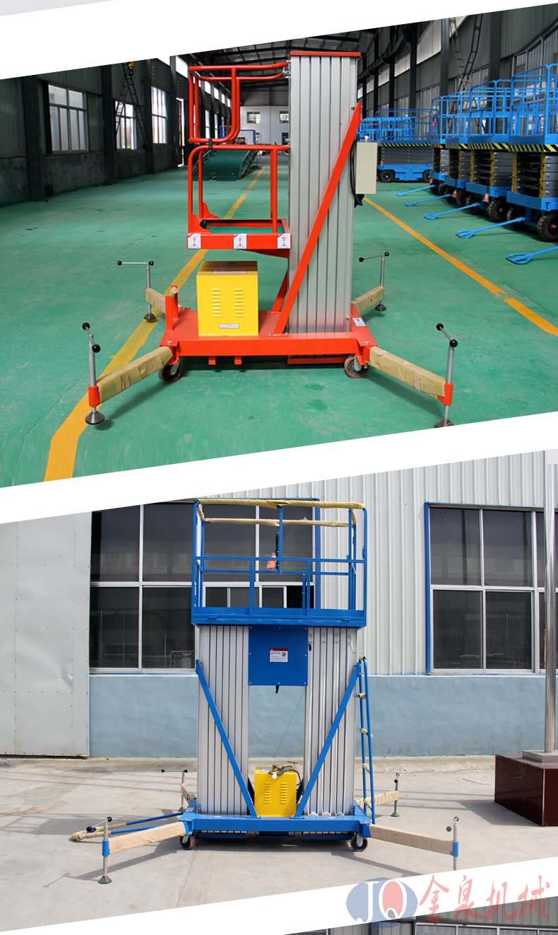 單柱鋁合金升降機:該系列產(chǎn)品為室內(nèi)型,廣泛適用于星級酒店,大型超市等各行業(yè)大廳、廠房內(nèi)的高空作業(yè), 具有升降平衡,操作方便,能進入一般門廳,可隨意進出電梯且耗電少、無污染、工作時不傷 地面,可用于貼墻工作及探出作業(yè),工作無死角。單立柱式鋁合金電動升降機配上龍門跨架附件,非常適合于影劇院、會堂、教堂等的維修工作。該龍門跨架組裝容易,操作省力,移動靈活,可跨越高度達1.1m的固定座椅等障礙物,并可在臺階上穩(wěn)定 作業(yè)。 高強度矩形鋼管制作, 剛性、穩(wěn)定性好。 配有萬向腳輪,機動靈活。 兩端架跨距可調(diào),能適 用于跨越不同障礙物的要求。 兩端架垂直可調(diào),可用于一定坡度的斜面或臺階上作業(yè)。